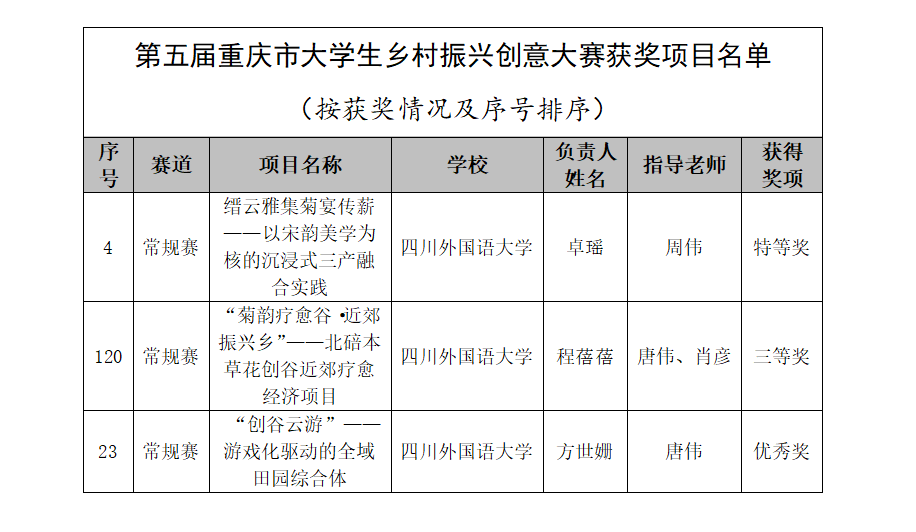 近日,由重庆市教育委员会、重庆市农业农村委员会、重庆市文化和旅游发展委员会联合主办的第五届重庆市大学生乡村振兴创意大赛落幕。我院卓瑶、程蓓蓓、方世姗等同学作为负责人申报的项目荣获一项特等奖、一项三等奖、一项优秀奖。