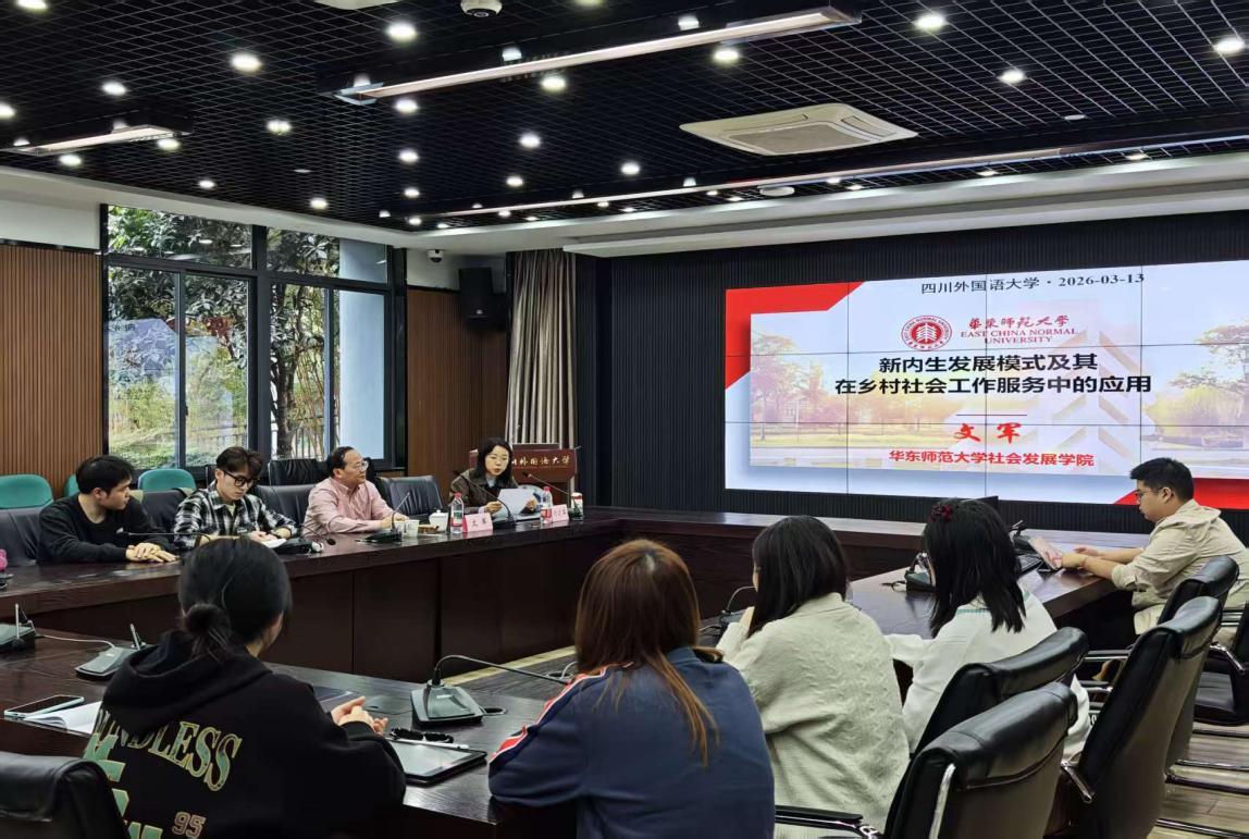 2026年3月13日下午,四川外国语大学国际法学与社会学院于立德楼C117举办了一场主题为“新内生发展模式及其在乡村社会工作服务中的应用”的学术讲座。此次讲座特别邀请了华东师范大学社会发展学院院长、教育部“长江学者”文军教授担任主讲人,文教授结合过去6年的乡村实践项目经验,为同学们系统讲解了基于新内生发展视角的社区为本乡村社会工作服务模式。讲座由MSW教育中心副主任穆莉萍老师主持,我院全体2025级社会工作专业研究生共同参加了此次活动。