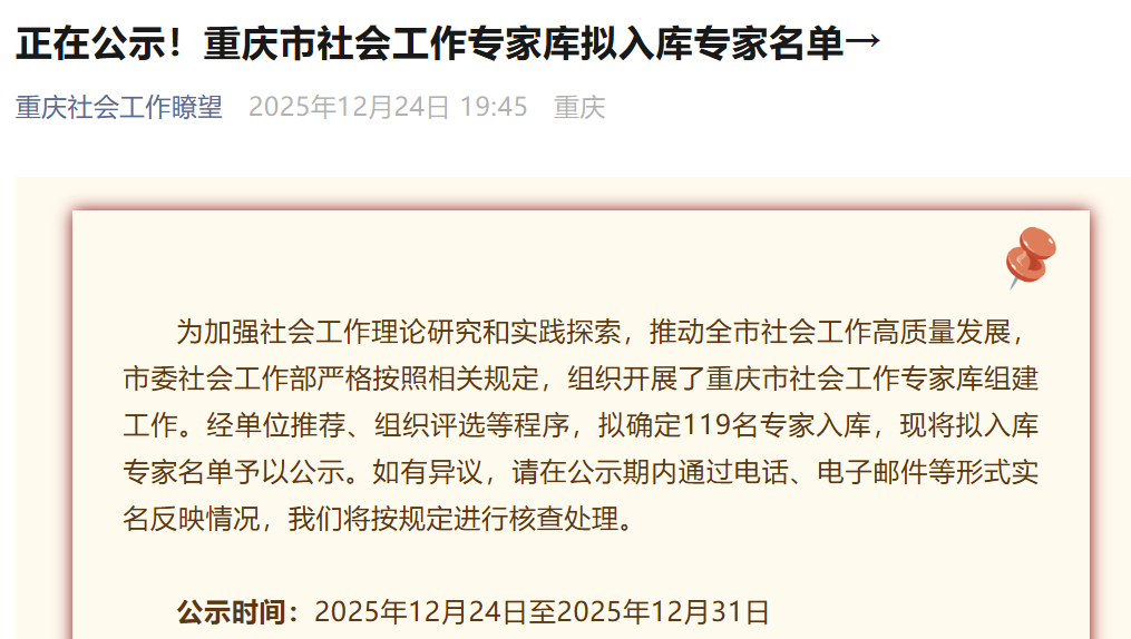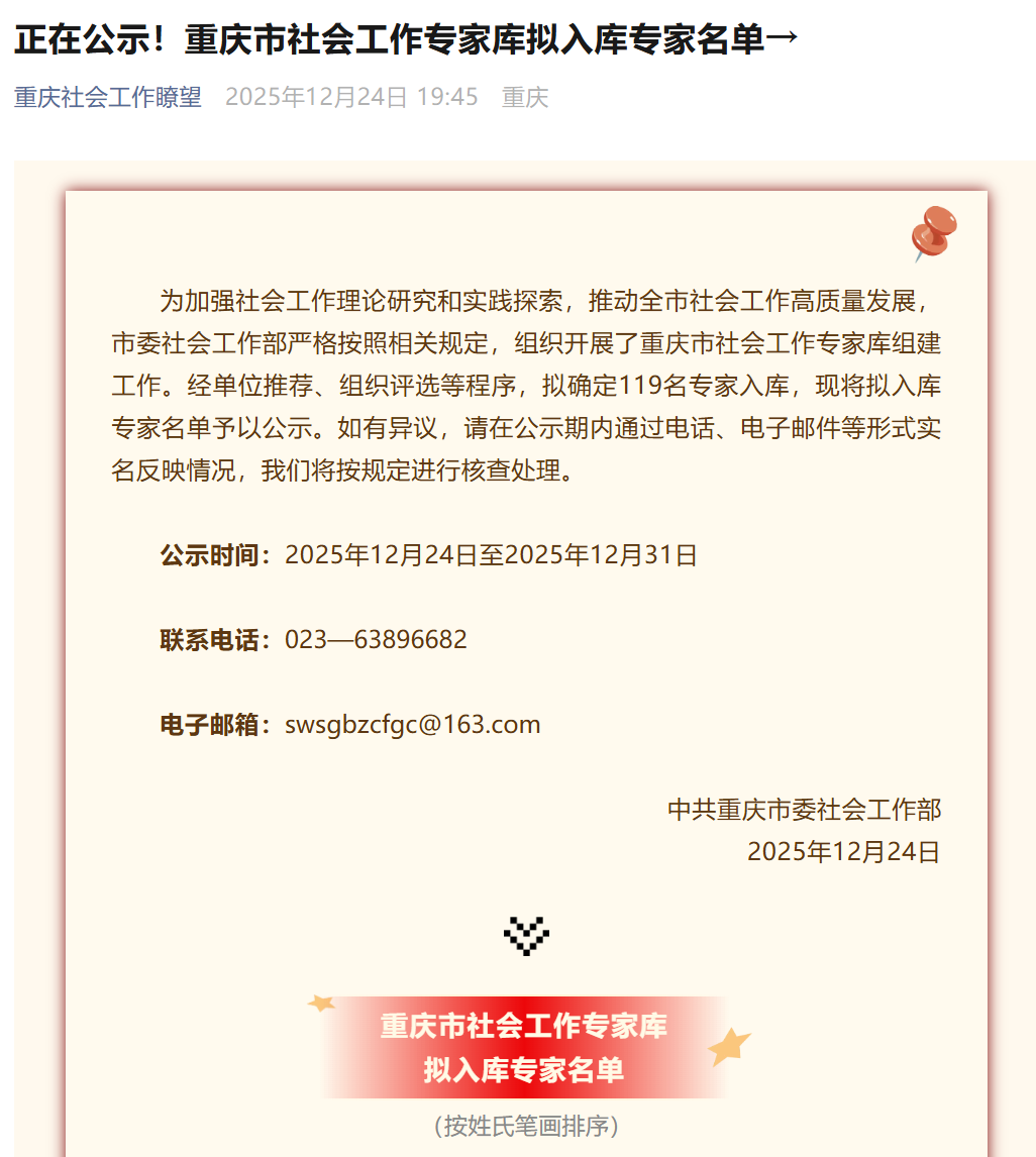 近日,中共重庆市委社会工作部发布重庆市社会工作专家库名单,我院肖彦、童峰、穆莉萍三位老师成功入选,充分彰显了我院教师在社会工作领域的专业影响力与学科竞争力。