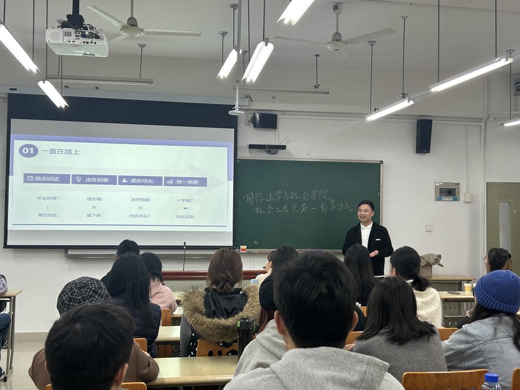 随后,高级社工师、川外社工专硕行业导师刘路老师带来了题为《十二年社工路:在实践中发现的意义》的分享。作为一位执行过40多个社工项目的“资深玩家”,刘路老师以其十二年的坚守与探索,向同学们展示了社工事业的广度与无限可能。他从自身的职业轨迹出发,分享了在不同领域的实务经验与管理心得,阐述了如何在持续的实践中不断发现社工工作的价值与意义,为同学们勾勒出一幅清晰而充满激励的职业发展蓝图。