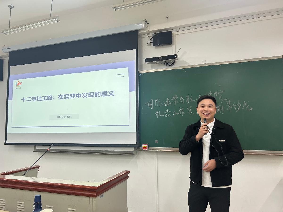 为深化社会工作专业学生对行业的认知,搭建理论与实务的桥梁,明晰职业发展规划,2025年11月5日上午10时,国际法学与社会学院为全体大三社会工作专业学生精心策划的“社会工作实务-前辈沙龙”在期待中拉开帷幕。本次活动特邀两位深耕实务一线的资深前辈——优秀校友匡国奉学姐与行业导师刘路老师,分享他们的真实故事与宝贵经验,为学子们带来一场关于专业、成长与坚守的思想盛宴。