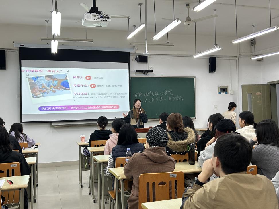 首位分享嘉宾是学院2016级优秀校友、现就职于北京枫林社会工作发展中心并驻点重庆大学附属肿瘤医院的匡国奉学姐。她以《在生命的两旁“种花”:医务社工从“善意”到“专业”的成长日记》为题,为学弟学妹们翻开了一部充满温度与力量的成长记录。匡学姐结合其在乳腺肿瘤患者服务一线的真实案例,生动讲述了如何将书本上的理论知识、最初的朴素善意,系统性地转化为严谨、有效的专业服务。她以“种花”为喻,描绘了医务社工如何在患者生命中最艰难的时刻播撒希望、提供支持,深刻展现了社会工作服务的深度与人文关怀。