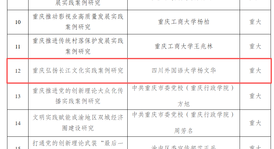 近日,习近平文化思想研究中心重庆市协同研究基地2025年度项目立项名单正式公布。我院杨文华教授围绕“重庆弘扬长江文化实践案例研究”选题方向申请的项目获准立项。据悉,该项目立项为重庆市社会科学规划重大项目,为我院学科发展和学校科研事业注入新的动力。接下来,我院将高度重视项目研究推进,凝聚团队力量、强化过程管理,产出高质量、有分量的研究成果,为重庆践行习近平总书记“把长江文化保护好、传承好、弘扬好”的重要嘱托,扎实推进长江文化建设与长江经济带高质量发展,彰显“上游担当”提供智力支撑。