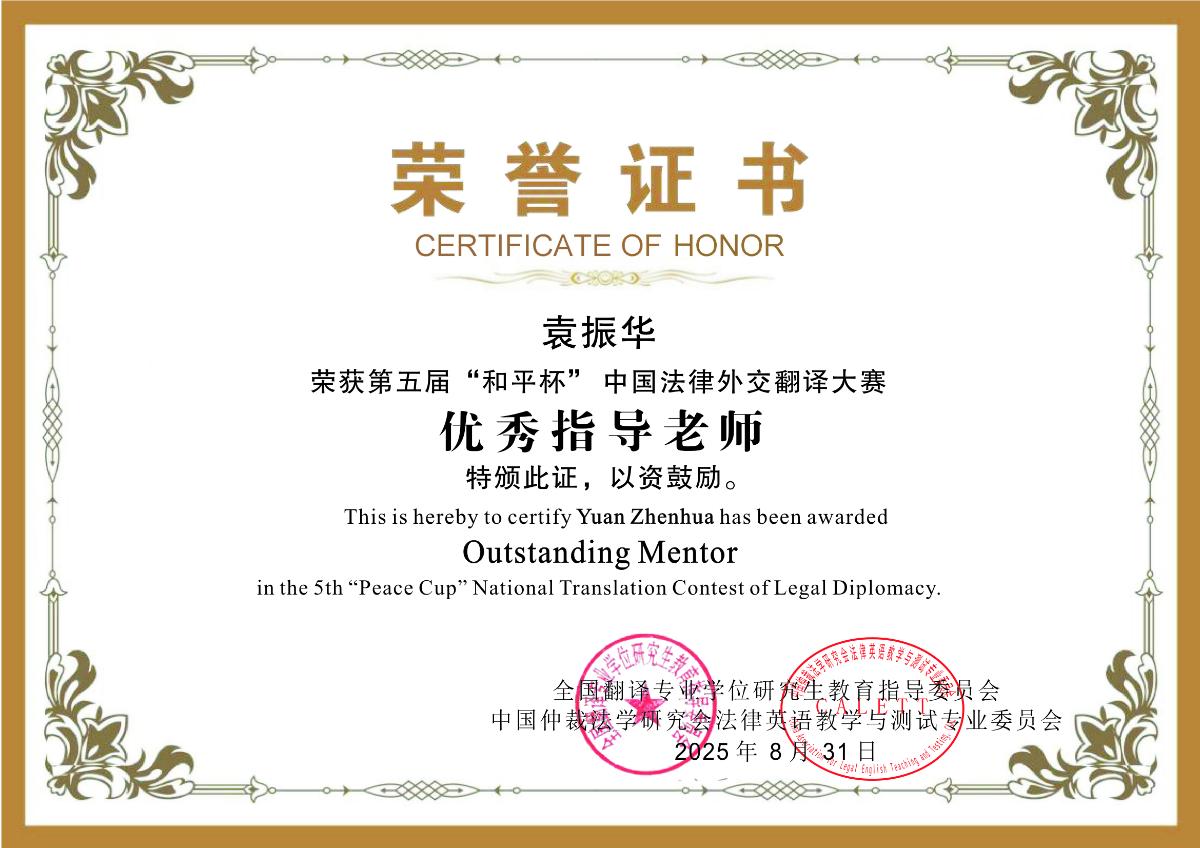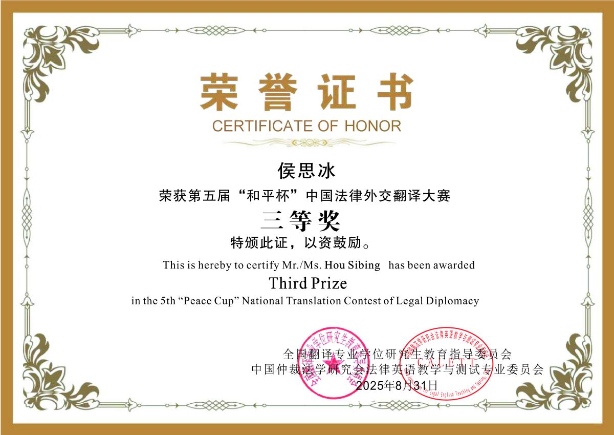近日,由全国翻译专业学位研究生教育指导委员会指导,中国仲裁法学研究会法律英语教学与测试专业委员会、中国政法大学、甘肃政法大学、四川外国语大学等单位联合主办,中南财经政法大学承办的“第五届‘和平杯’中国法律外交翻译大赛”顺利落幕。我院法学专业侯思冰同学在袁振华老师指导下荣获大赛三等奖,袁振华老师获优秀指导老师奖