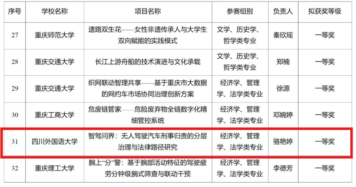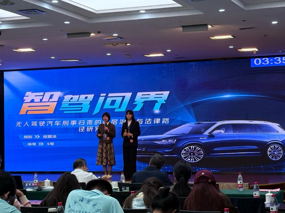 重庆市首届大学生新文科实践创新大赛现场决赛于2025年10月14日在重庆师范大学成功举行。此次大赛由重庆市教育委员会主办,重庆师范大学承办,吸引了来自全市24所高校的1178个项目和9000余名师生参与。经过激烈角逐,我院“智驾问界:无人驾驶汽车刑事归责的分层治理与法律路径研究”项目荣获经管法组一等奖。