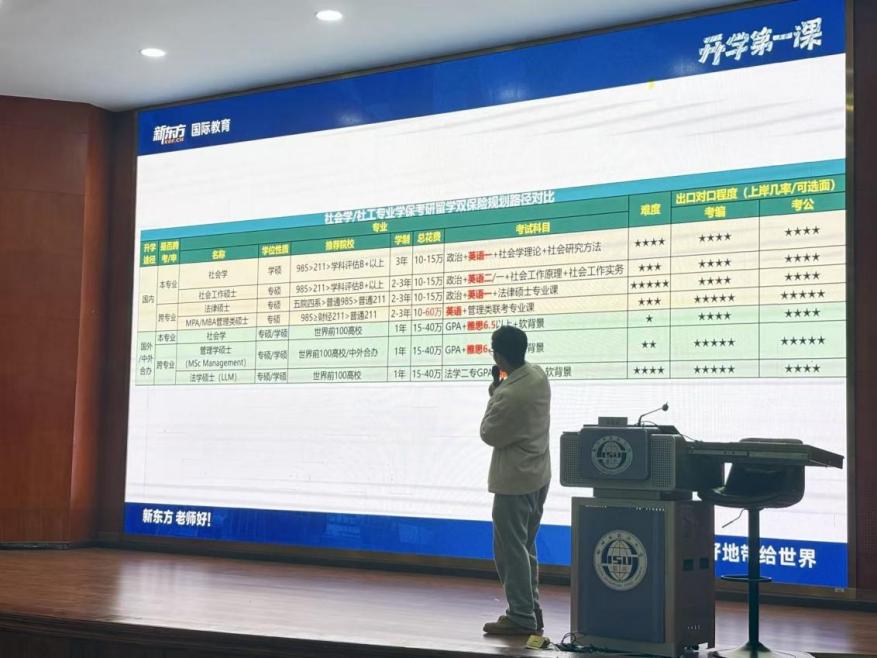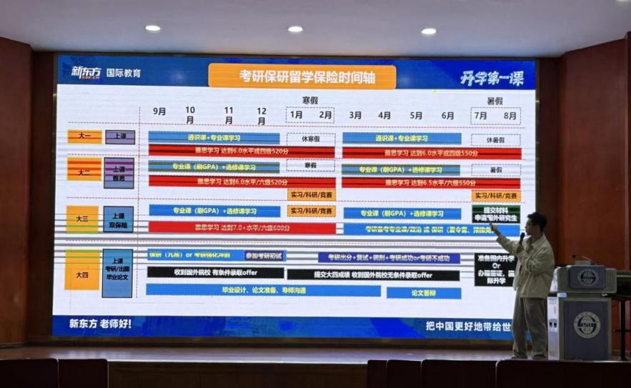 秋意渐浓,锐意进取,知晓学习目标,明晰未来规划。为帮助2025级本科生明确学习目标、科学规划未来发展,115日,学院于东区培英楼放映厅举办学业规划专题讲座。本次讲座特邀新东方雅思学科运营负责人、人力资源经济师李淼(Mike)老师担任主讲,围绕就业、升学深造、留学选择、实习实践等方向,为同学们提供系统性指导。