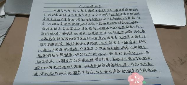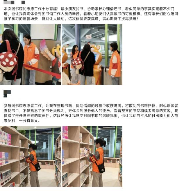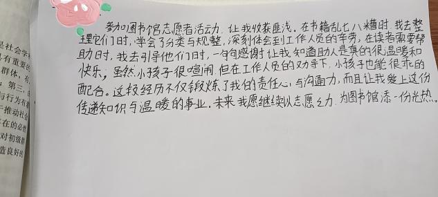 “原本以为整理图书只是简单的体力活,真正上手才发现,不仅要熟悉分类规则,还要有足够的耐心和细心,一天下来虽然腰酸背痛,但看着整齐排列的书架,心里满是成就感。”一位志愿者在手写心得中这样写到。另一份心得里则记录着温暖的瞬间:“遇到一个腼腆的小朋友,说想看关于星星的书,我带着他在自然科学区慢慢寻找,找到后他怯生生地说了句‘谢谢姐姐’,那一刻,所有的疲惫都烟消云散,只觉得这份志愿工作特别有意义。”从最初面对读者咨询时的略显生涩,到后来能熟练梳理书架分类、主动询问读者需求,同学们在周末两天的服务中收获颇丰:有人在与不同读者的沟通中提升了表达与应变能力;有人在重复的整理工作中体会到了“坚持”与“责任”的重量;有人在见证小读者专注阅读的眼神时,读懂了知识传递的温暖价值;更有人在服务中明白了“奉献不是单向付出,而是双向奔赴的成长”。
