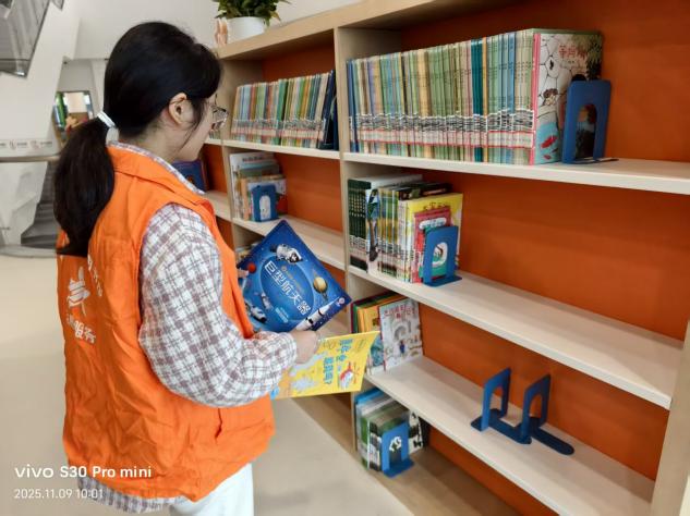 志愿者们的工作看似平凡却不可或缺:或是蹲在书架旁,按照分类编号将错放的绘本、科普书、文学名著逐一归位,让每一本书都“各归其家”;或是耐心引导小读者穿梭于书架之间,帮他们找到心心念念的书籍;或是为初次借阅的家长细致讲解自助借还机的操作步骤、借阅规则;又或是及时整理散乱的报刊杂志、维护阅览区域的安静秩序。这些琐碎而具体的工作,直接保障了周末借阅高峰时段图书馆的高效有序运转,为广大读者营造了整洁、舒适的阅读环境。志愿者们在书架之间传递温暖,让川外学子的青春身影成为周末少儿图书馆里一道亮眼的风景线,用实际行动诠释青年一代的责任与担当。