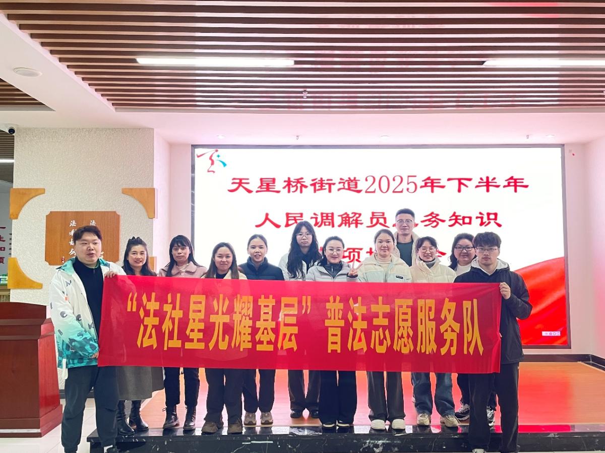 122日下午,四川外国语大学国际法学与社会学院“法社星光耀基层”普法志愿服务队联合天星桥司法所、天星桥街道及两江新区观音桥街道“老马工作室”,在天星桥街道党群服务中心开展了“新时代调解员能力提升”专题培训。10余名社区专职负责调解工作的工作人员及物业纠纷调解员现场接受培训,通过理论讲解、实操演练、互动交流等形式,沉浸式学习新时代“枫桥经验”的基层实践路径,法社学院多名志愿者现场协助培训开展。